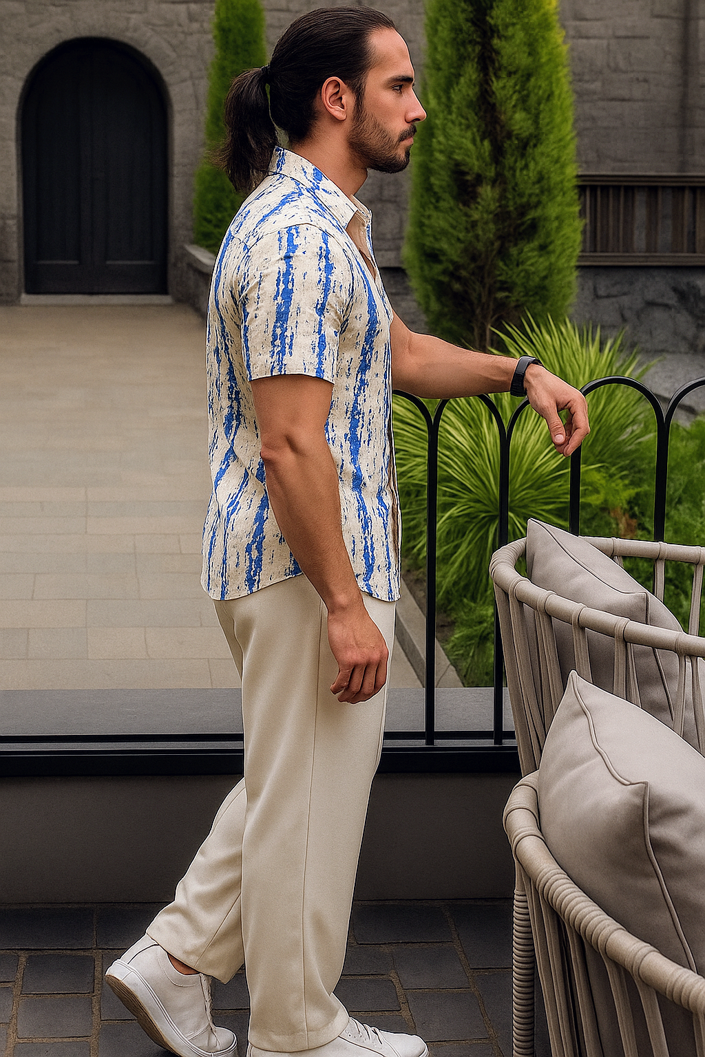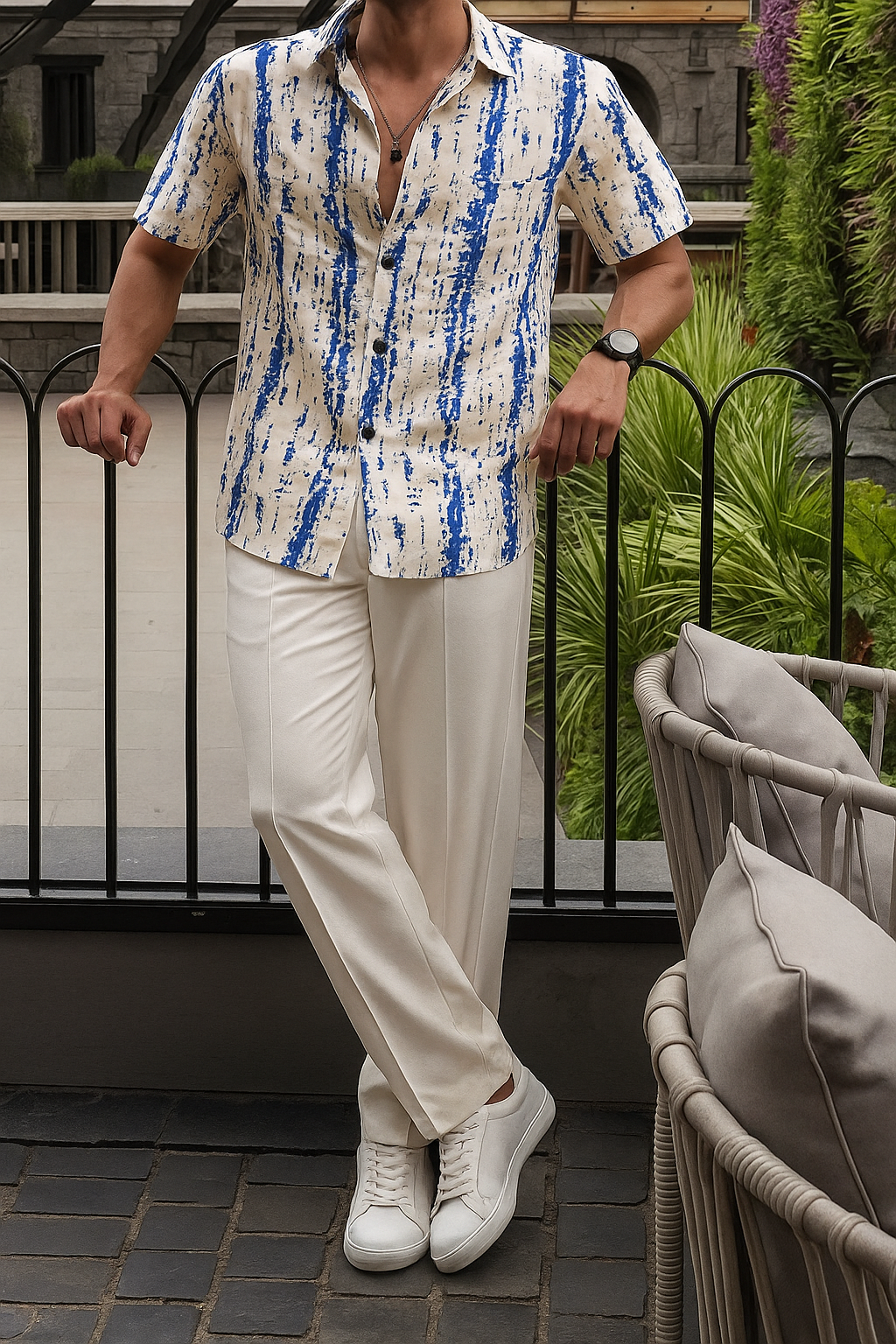 Lean into the light tones of the shirt by pairing it with off-white linen trousers or stone-colored chinos. Complete the look with silver-toned accessories and a metal-link watch to match the cool Navy tones of the print.