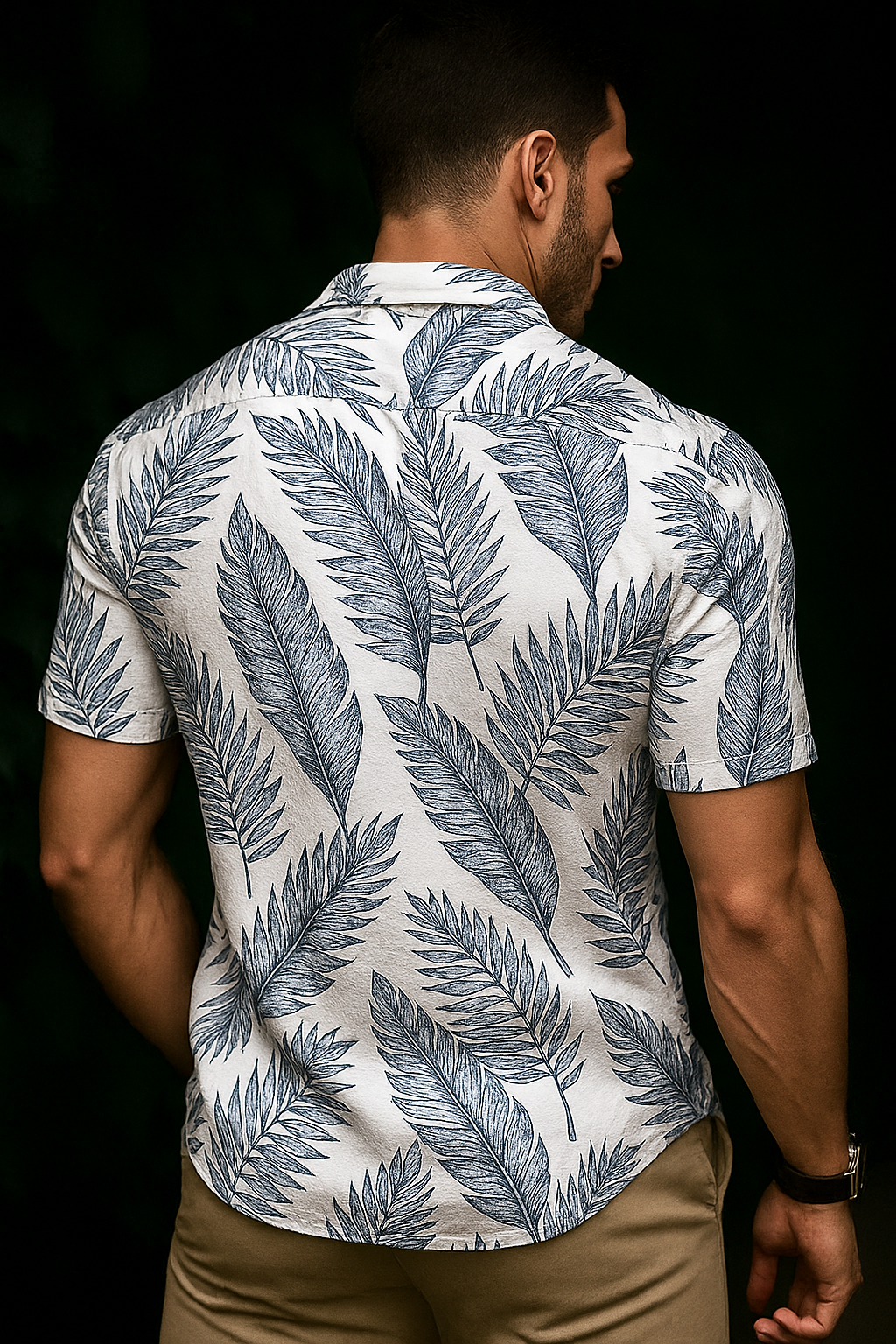 Men’s Sketch-Leaf Linen Blend Button-Down – White & Slate Blue