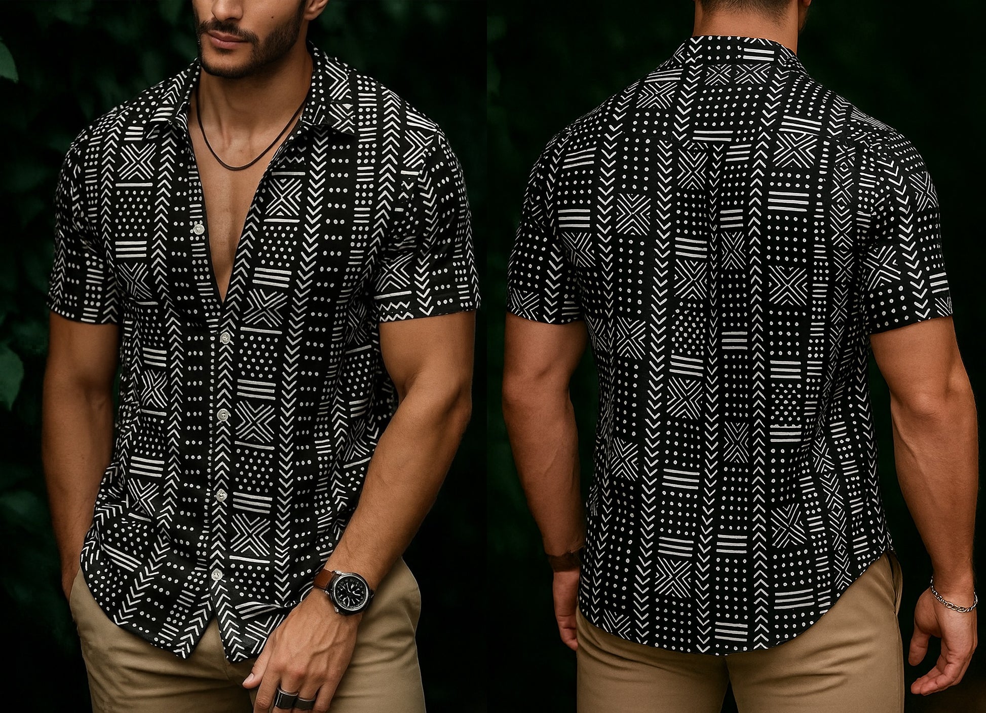 Title: Men’s Tribal Geometric Motif Button-Down – Onyx & Ivory Short-Sleeve Heritage Print Shirt